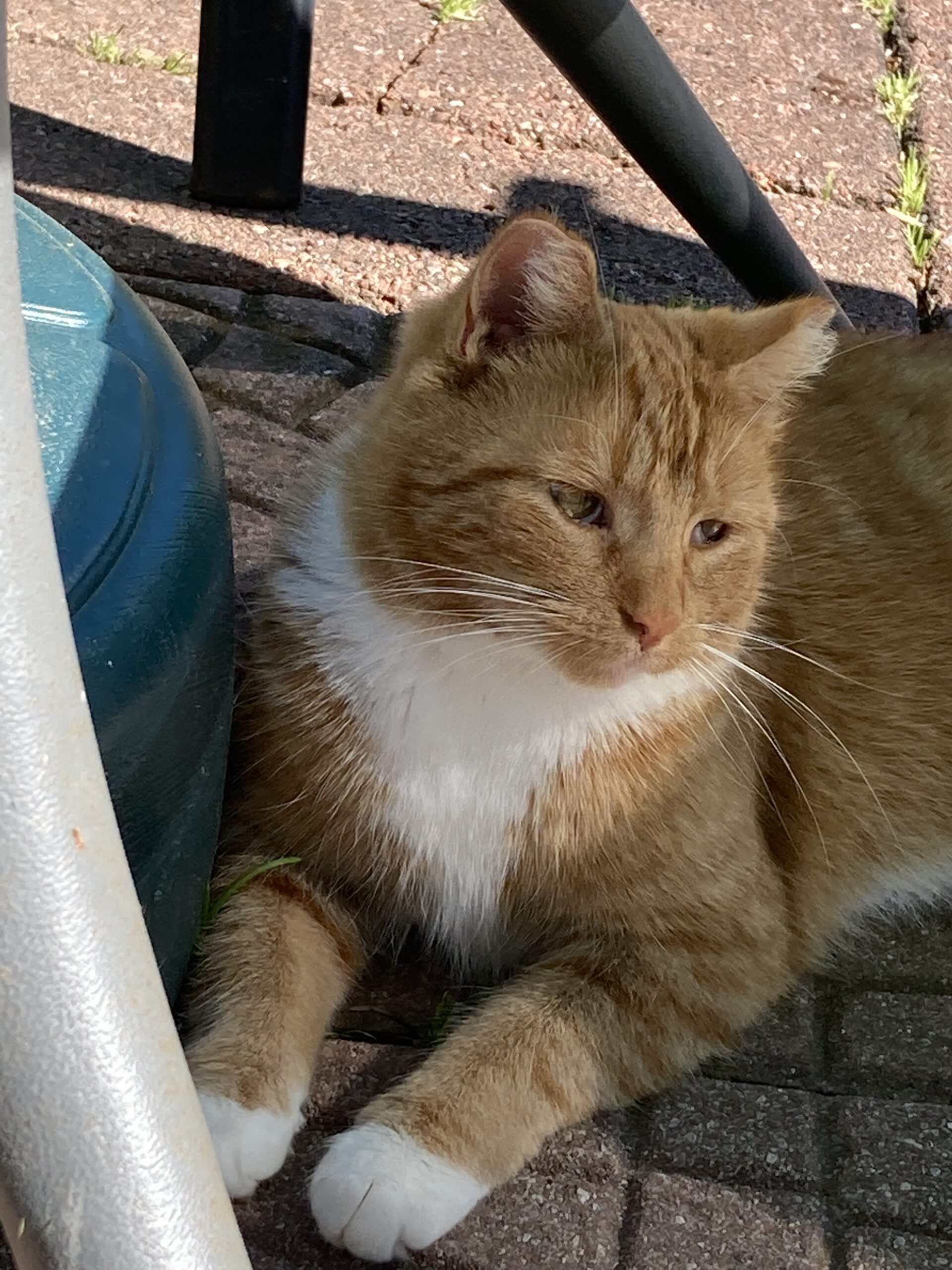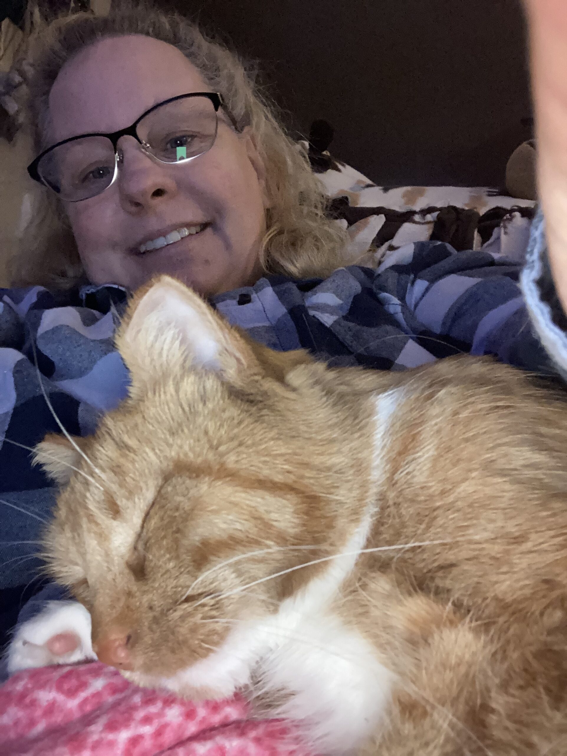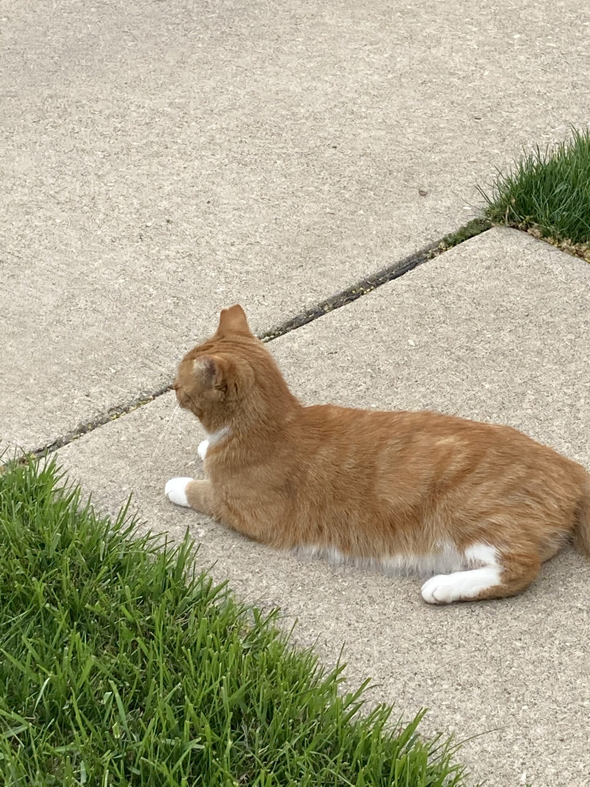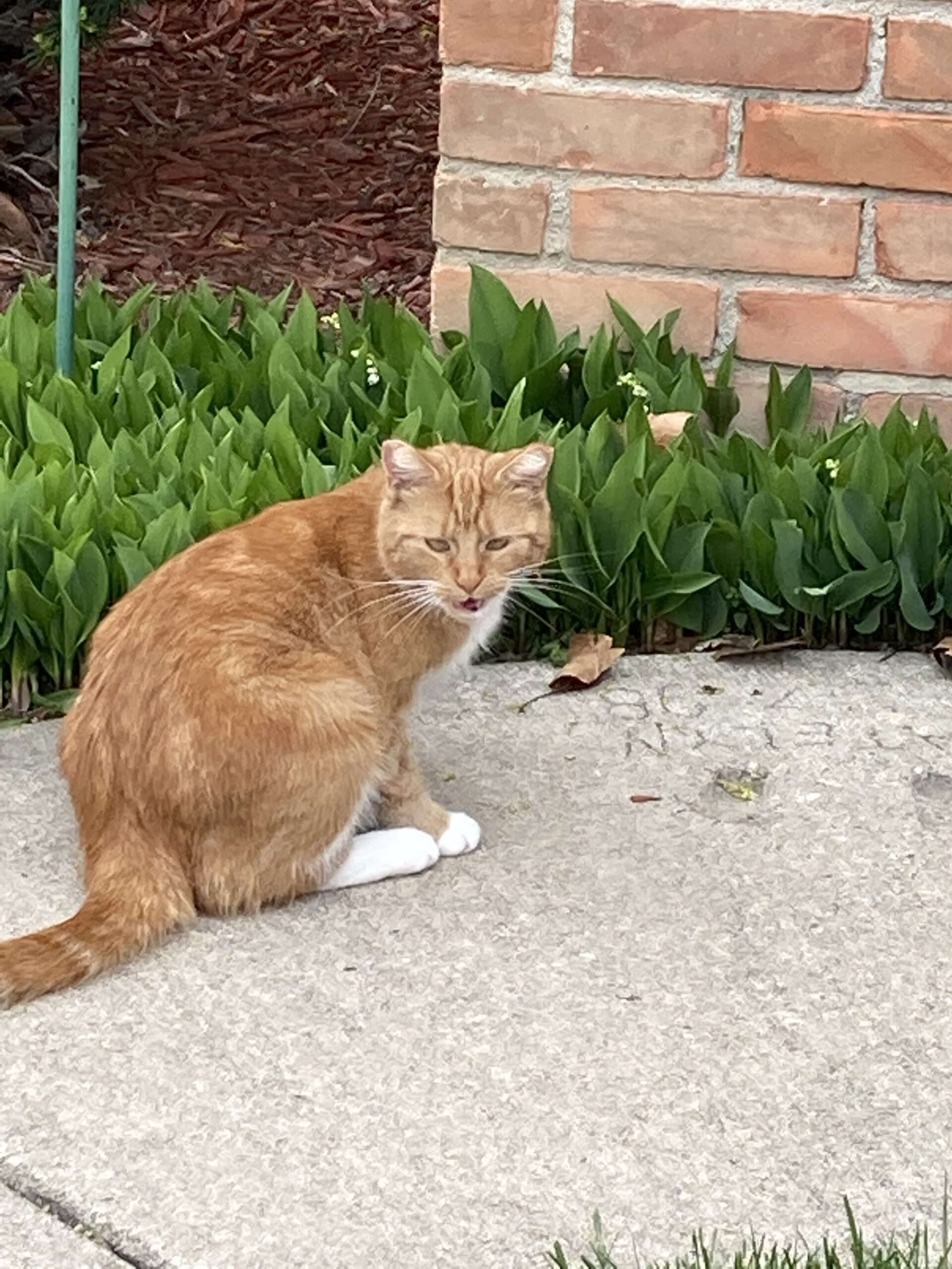 Pumpkin was a stray cat. We had just arrived home from driving to Florida to get my mom after having a stroke. Pumpkin would hang out in our driveway. I have her chicken and tuna. She devoured it like she hadn’t eaten in a long time. This kind of feeding went on for month. We originally thought that Pumpkin was a boy. She was very skittish. She wouldn’t let us get too close. We would prop our screen door open so she could come and go as she liked. Slowly, she would get closer and would rub against our legs and let us pet her. We had to keep the door open all the time. One night she jumped up on the couch next to me, lay down, and let me pet her. After several weeks of doing this and the weather getting colder, I asked my husband if she could stay in the house that night. He said no. A while later, my husband fell asleep in the recliner. I woke him up and told him to go to bed. The minute his foot hit the hallway, I looked at Pumpkin and said, “Guess who’s staying in the house tonight?” She stayed on the couch all night. She stayed every night during the winter months. She would go outside during the daytime and come back in the evening. I took her to the vet and found out our Pumpkin was a girl. I had her chipped. She was now mine. I am allergic to animals. For the past 5 1/2 years, I have been taking an allergy pill every day just so I can be with my Pumpkin. She would come inside in the evening and jump up on my lap. If I was playing on my iPad, she would do anything she could so that I couldn’t see what I was playing on it. Sometimes she would lay so high on my chest, that it looked like I was wearing her for a scarf. The other day, she didn’t come home in the morning to eat. I called for her over and over. We were backing out of our driveway; I looked behind the bushes in the front yard where she lays sometimes. I thought I saw her legs, so I pulled forward to get a better look. Sure enough, I saw her legs. I got out of the car and walked over to where she was. I called her name and she didn’t move. As I got closer, I could see a bunch of ants on her eyes. I yelled for my husband. I tapped her with them foot, she was stiff. This was so upsetting. I thought my baby girl would be around forever. We miss her so much. I keep wanting to get up and see if she’s waiting at the back door. Or, if she’s laying in the garden. Pumpkin girl, rest in peace. Some day we will be together again. We love you and miss you so much.