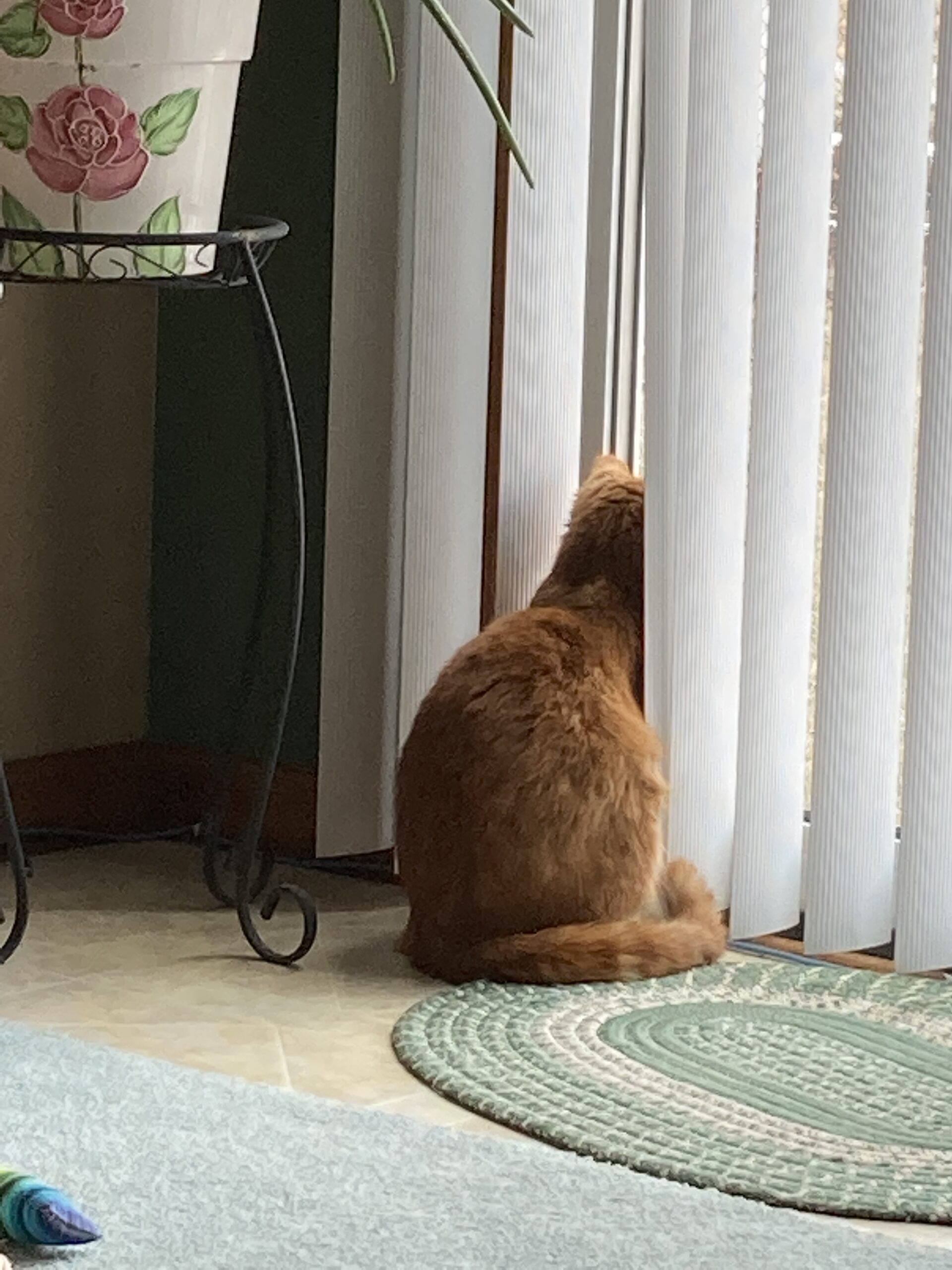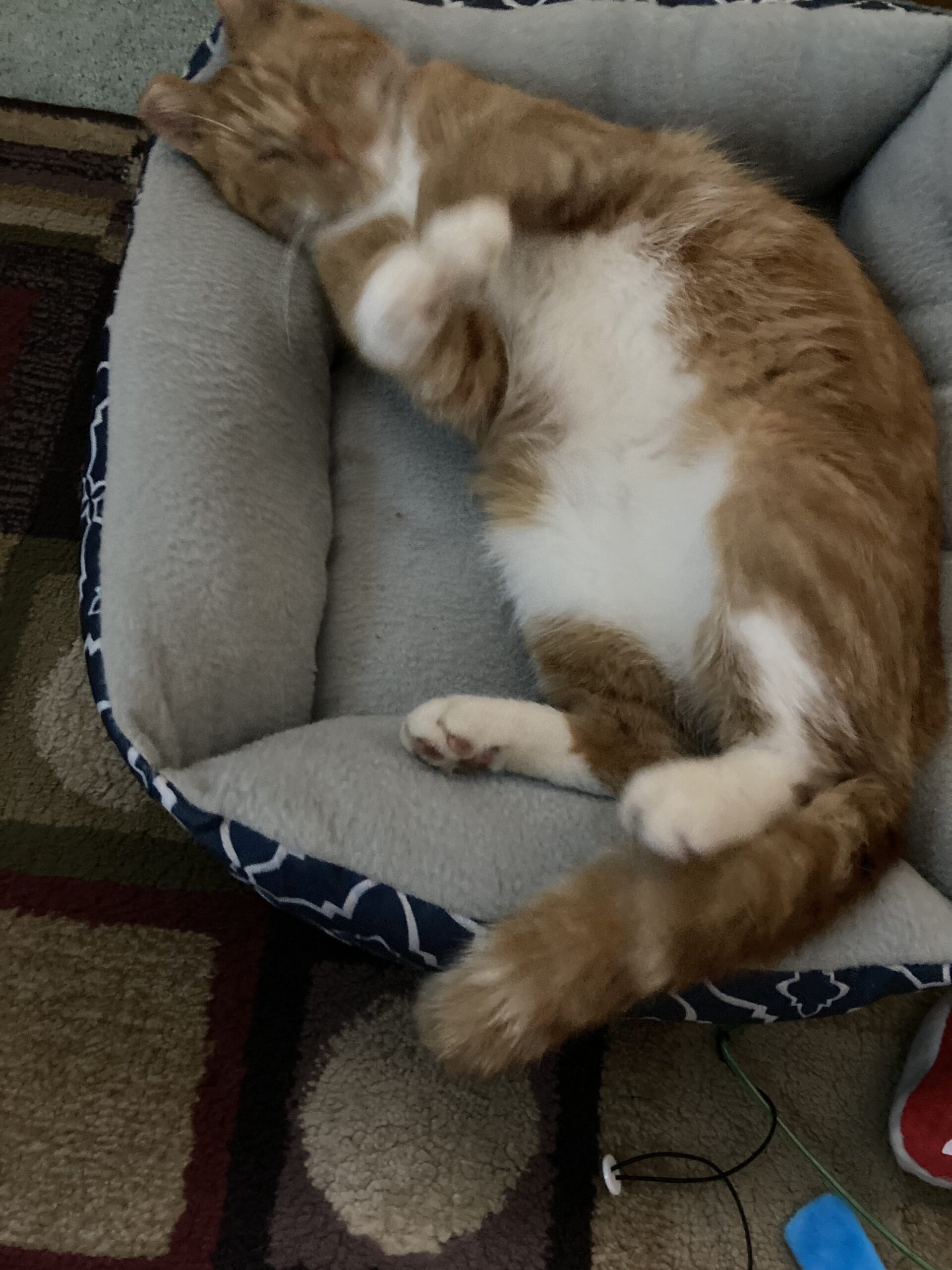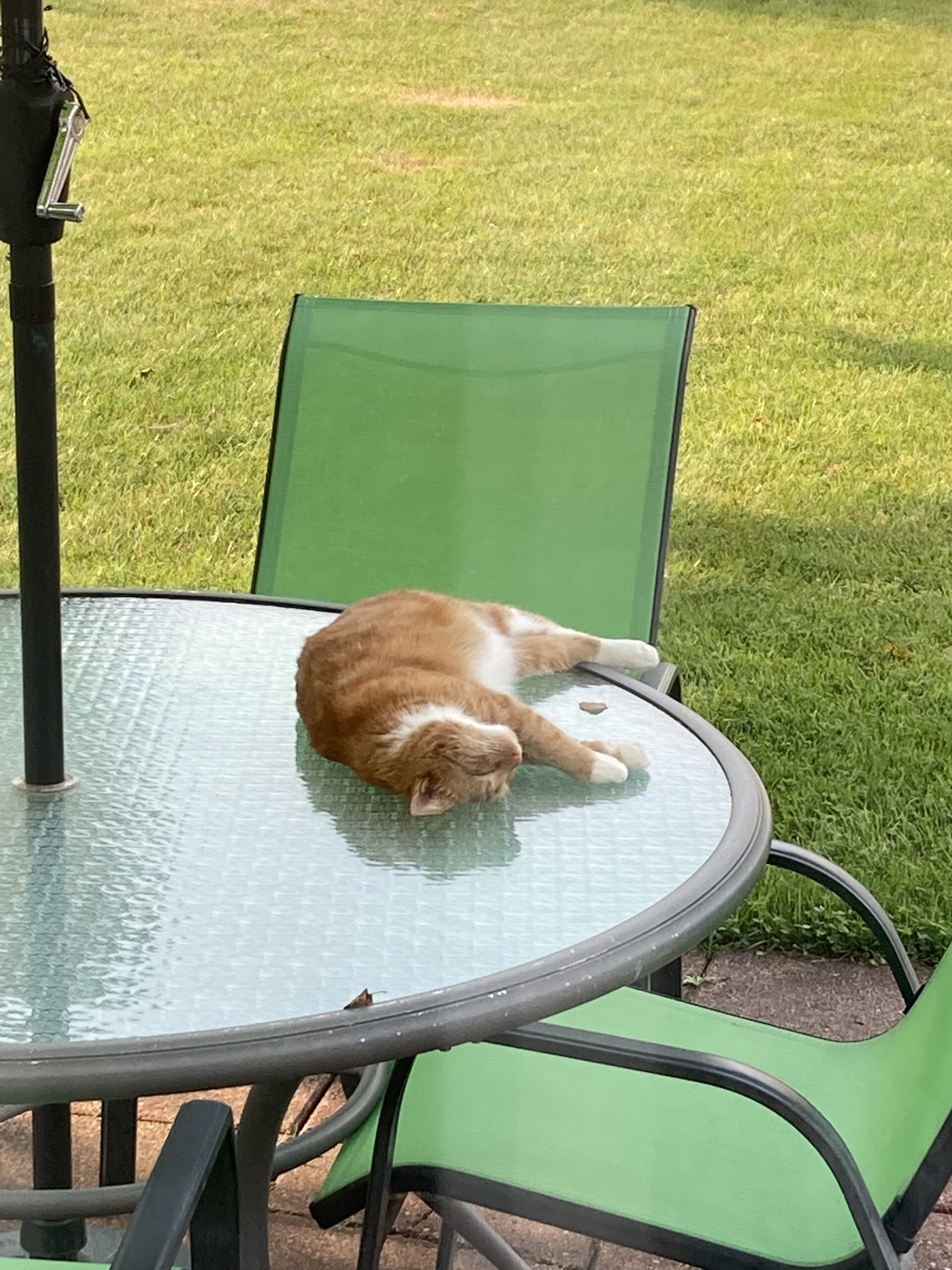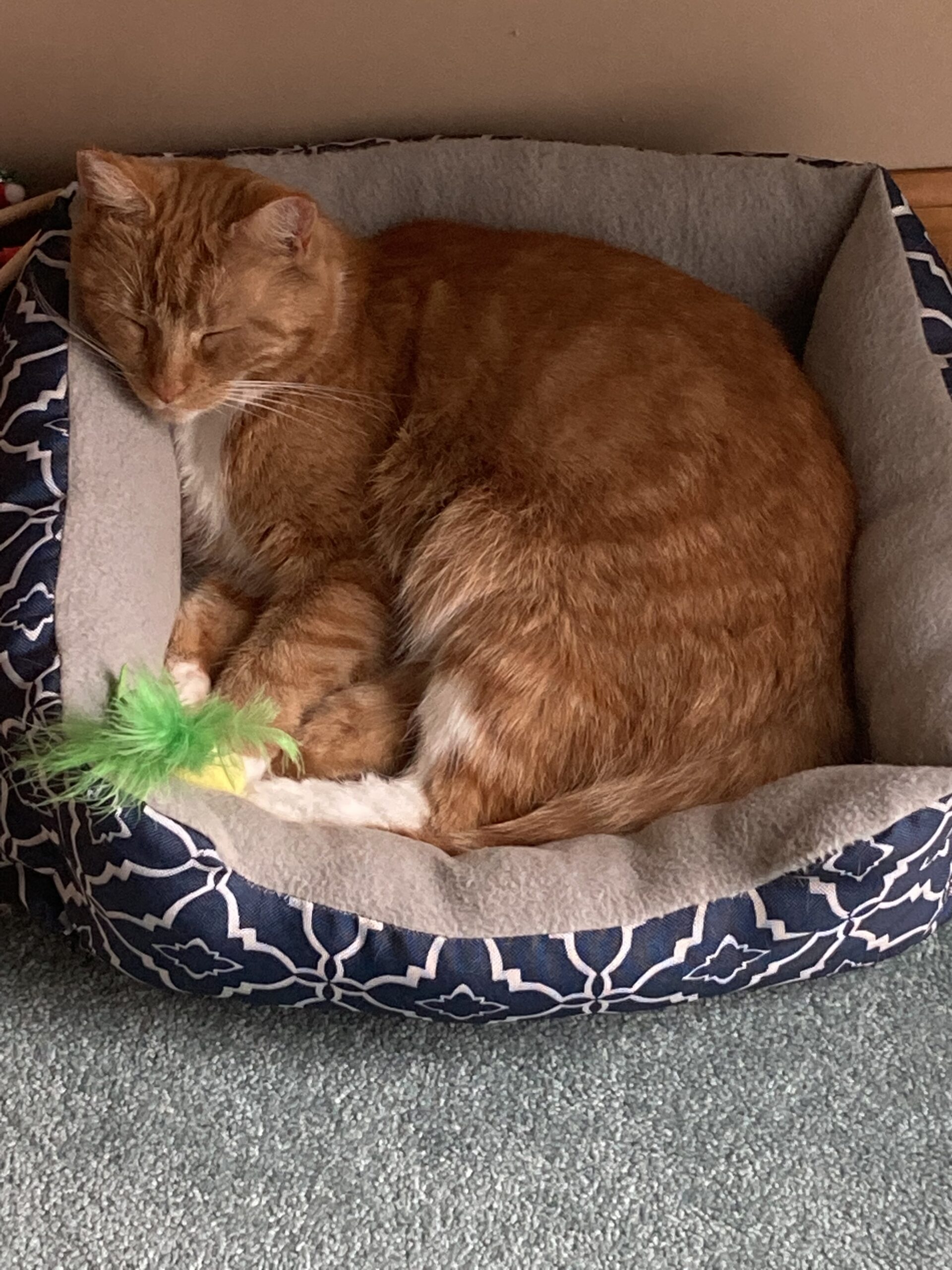 Pumpkin was a stray cat. We had just arrived home from driving to Florida to get my mom after having a stroke. Pumpkin would hang out in our driveway. I have her chicken and tuna. She devoured it like she hadn’t eaten in a long time. This kind of feeding went on for month. We originally thought that Pumpkin was a boy. She was very skittish. She wouldn’t let us get too close. We would prop our screen door open so she could come and go as she liked. Slowly, she would get closer and would rub against our legs and let us pet her. We had to keep the door open all the time. One night she jumped up on the couch next to me, lay down, and let me pet her. After several weeks of doing this and the weather getting colder, I asked my husband if she could stay in the house that night. He said no. A while later, my husband fell asleep in the recliner. I woke him up and told him to go to bed. The minute his foot hit the hallway, I looked at Pumpkin and said, “Guess who’s staying in the house tonight?” She stayed on the couch all night. She stayed every night during the winter months. She would go outside during the daytime and come back in the evening. I took her to the vet and found out our Pumpkin was a girl. I had her chipped. She was now mine. I am allergic to animals. For the past 5 1/2 years, I have been taking an allergy pill every day just so I can be with my Pumpkin. She would come inside in the evening and jump up on my lap. If I was playing on my iPad, she would do anything she could so that I couldn’t see what I was playing on it. Sometimes she would lay so high on my chest, that it looked like I was wearing her for a scarf. The other day, she didn’t come home in the morning to eat. I called for her over and over. We were backing out of our driveway; I looked behind the bushes in the front yard where she lays sometimes. I thought I saw her legs, so I pulled forward to get a better look. Sure enough, I saw her legs. I got out of the car and walked over to where she was. I called her name and she didn’t move. As I got closer, I could see a bunch of ants on her eyes. I yelled for my husband. I tapped her with them foot, she was stiff. This was so upsetting. I thought my baby girl would be around forever. We miss her so much. I keep wanting to get up and see if she’s waiting at the back door. Or, if she’s laying in the garden. Pumpkin girl, rest in peace. Some day we will be together again. We love you and miss you so much.